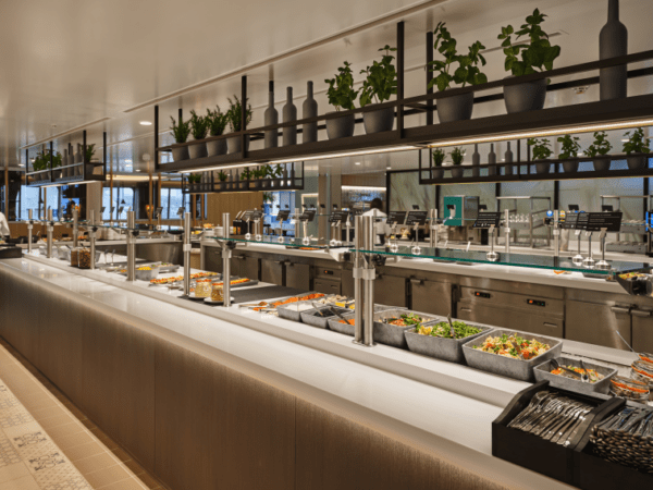 Delight Buffetissa nautit runsaan buffetin herkuista. Lounaalla ja illallisella (lähdöt alkaen klo 13) virvoitusjuomat, kahvi, tee, olut ja viini hanoista sisältyy hintaan.